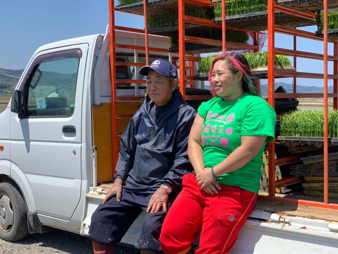 ビニールハウスで育てた苗を田んぼに運ぶ作業がきついきつい!