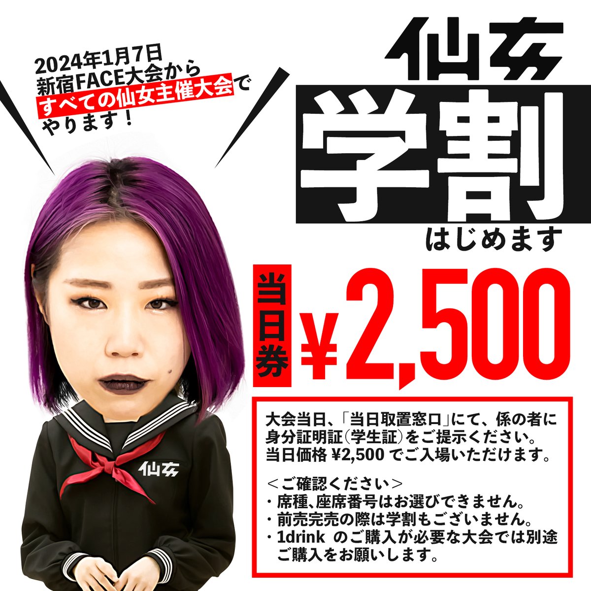 そんな私は今、プロレスラーになって「仙女」に所属している訳ですが、仙女も今年に入って学割を始めました!!!!