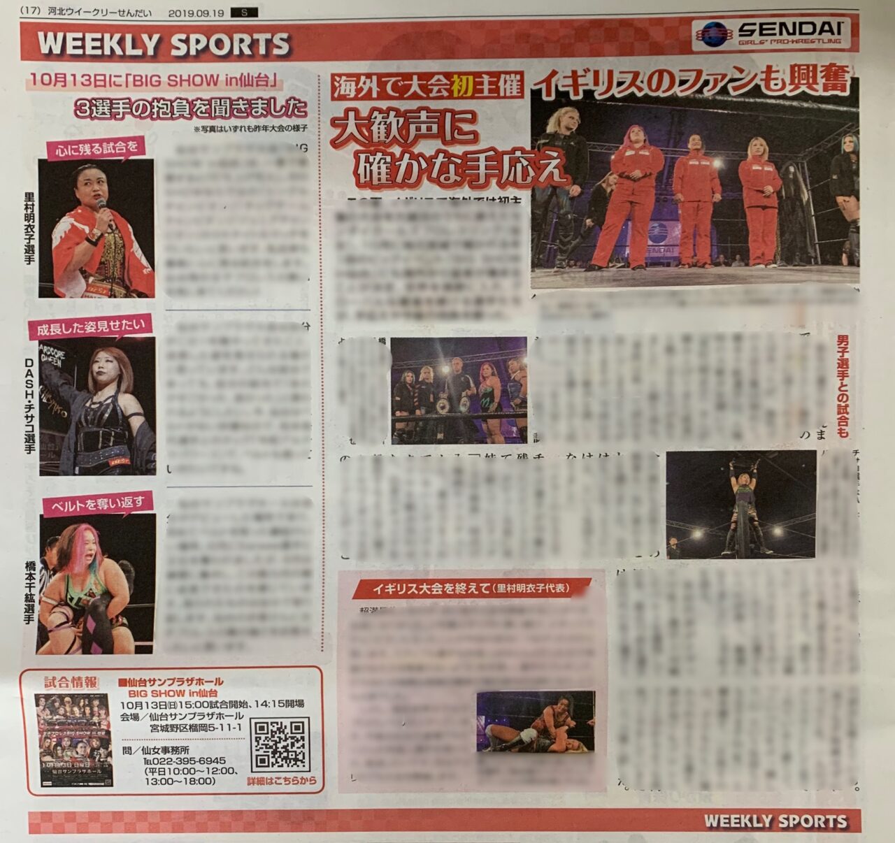 センダイガールズプロレスリング初の海外公演イギリスマンチェスター大会「SENDAI UK SHOW」について掲載されております。