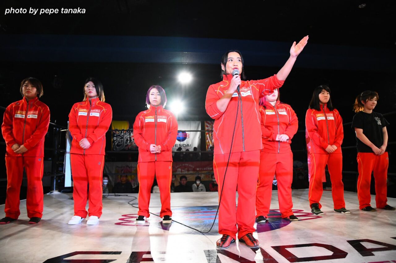 でも、たぶんセンダイガールズには今日はなんとしても開かなければならない理由があるんですよ。皆さんご存じと思いますけど、3・11の東日本大震災からあと3日後で丸9年がたちます。あのとき、それこそ先行きどうなるかわからなかった、プロレスを続けられるかどうかもわからないセンダイガールズが、今日またプロテスト一人受かって、ここまで人数増やして、こうやってここまで戻ってきてるんですよ。
