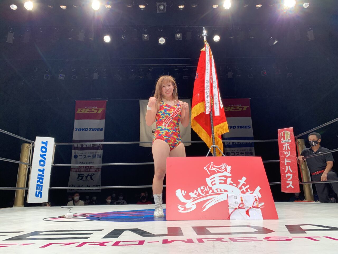 株式会社ヒューマンリソース様より金一封の贈呈。第1回じゃじゃ馬トーナメント優勝者 松本浩代選手より優勝旗の授与。